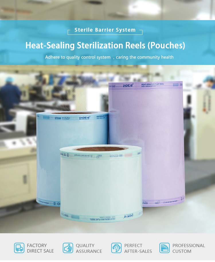 مصنوعة من ورق طبي وشفاف بوليمر متعدد الطبقات PET / PP. يتم طباعة مؤشرين مائيين وغير سامين للعملية للتعقيم بالبخار وأكسيد الإيثيلين على سطح الورق مما يمنع الجهاز من التلطخ