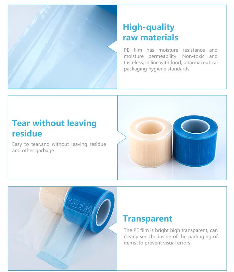 نطاق التطبيق: حماية كرسي الأسنان ، وحماية معدات طب الأسنان ، والعزل ، فيلم عجينة لصق على كرسي الأسنان ، لوحة مفاتيح التشغيل من كرسي الأسنان ، غطاء مصباح الأسنان ، مقبض الأسنان ، مقبض الباب وغيرها من الأماكن حيث تلمس اليد ، لعزل البكتيريا التأثير هو منع العدوى المتقاطعة ، وسهلة الاستخدام ، وإزالة وعدم البقاء ، يمكن للحافة غير لاصقة إزالة الفيلم واقية بسرعة.